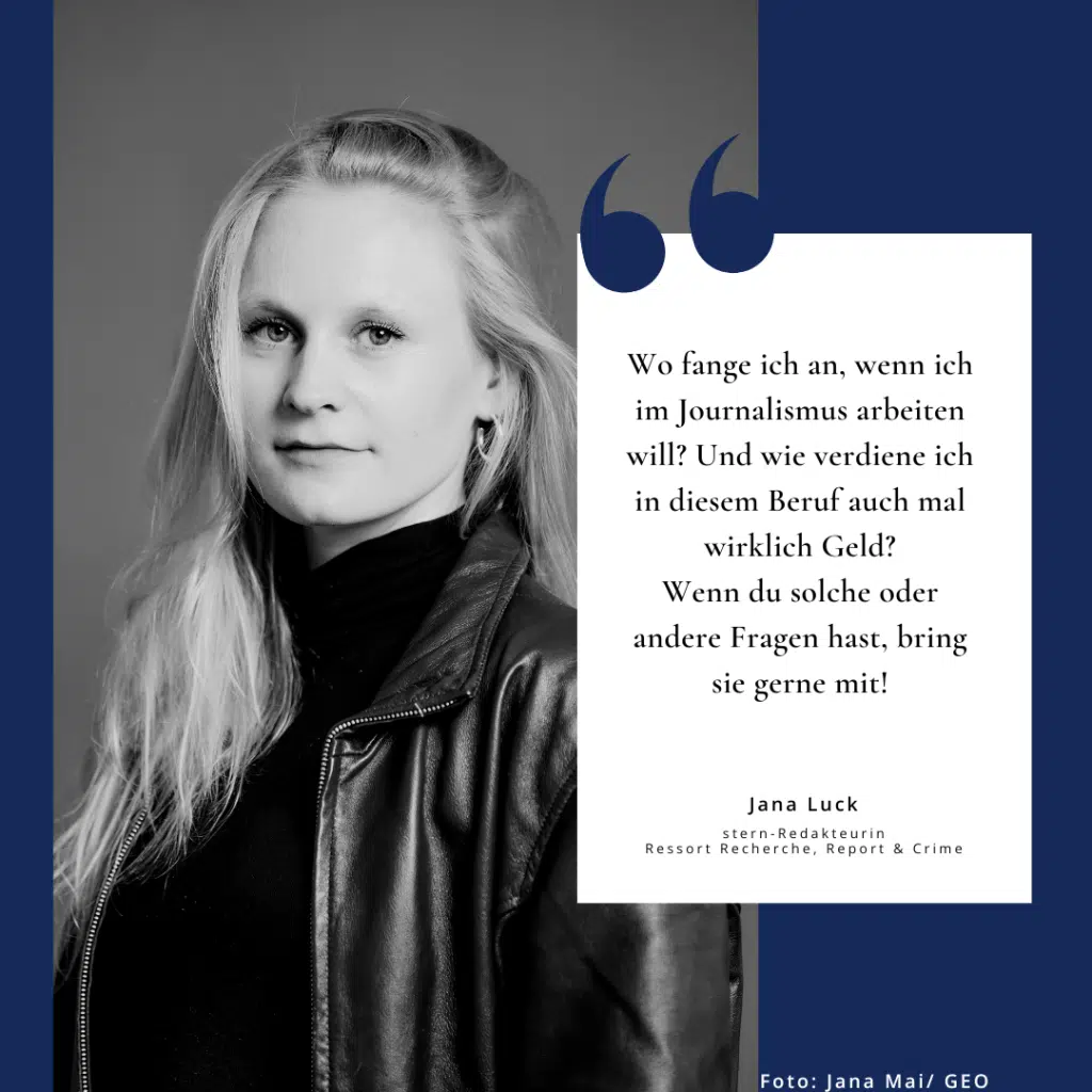 „Wo fange ich an, wenn ich im Journalismus arbeiten will? Was brauche ich unbedingt und worauf kann ich verzichten? Wie kann ich Kontakte in Redaktionen knüpfen? Und wie verdiene ich in diesem Beruf auch mal wirklich Geld? Wenn du solche oder andere Fragen hast, bring sie gerne mit“, sagt Jana Luck, Redakteurin beim stern im Ressort Recherche, Report & Crime.